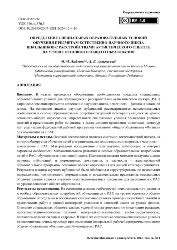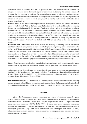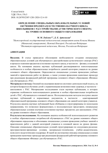 Обсуждение и заключения. В статье обоснована необходимость создания специальных образовательных условий при изучении предметов естественно-научного цикла, в частности – физики, в основной школе для учащихся с РАС даже в том случае, если они обладают парциальной одаренностью в области естественных наук. Специальные образовательные условия описаны и систематизированы по нескольким разделам, что будет содействовать их реализации в практической деятельности педагогов – преподавателей физики. Обсуждается перспектива исследования, связанная с апробацией выявленного комплекса специальных образовательных условий и экспертной оценкой практиков – учителей физики, работающих в условиях инклюзии в основной школе.
