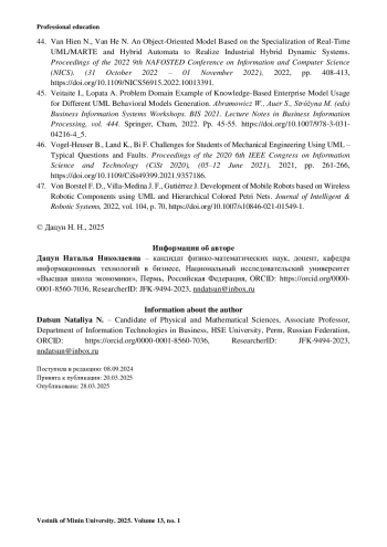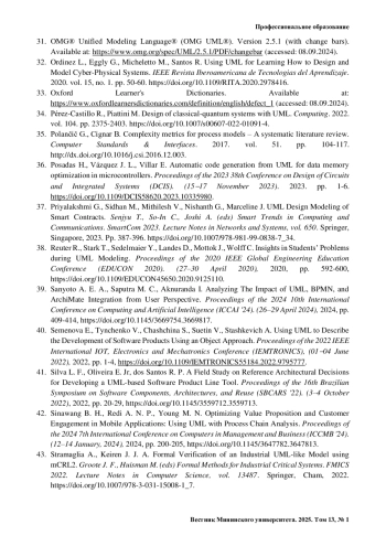 38. Reuter R., Stark T., Sedelmaier Y., Landes D., Mottok J., Wolff C. Insights in Students’ Problems during UML Modeling // Proceedings of the 2020 IEEE Global Engineering Education Conference (EDUCON 2020). (27-30 April 2020). 2020. Pp. 592-600. https://doi.org/10.1109/EDUCON45650.2020.9125110.