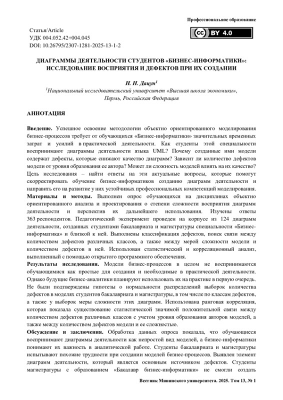 Введение. Успешное освоение методологии объектно ориентированного моделирования бизнес-процессов требует от обучающихся «Бизнес-информатики» значительных временных затрат и усилий в практической деятельности. Как студенты этой специальности воспринимают диаграммы деятельности языка UML? Почему созданные ими модели содержат дефекты, которые снижают качество диаграмм? Зависит ли количество дефектов модели от уровня образования ее автора? Может ли сложность моделей влиять на их качество? Цель исследования – найти ответы на эти актуальные вопросы, которые помогут скорректировать обучение бизнес-информатиков созданию диаграмм деятельности и направить его на развитие у них устойчивых профессиональных компетенций моделирования. Материалы и методы. Выполнен опрос обучающихся на дисциплинах объектно ориентированного анализа и проектирования о степени сложности восприятия диаграмм деятельности и перспектив их дальнейшего использования. Изучены ответы 363 респондентов. Педагогический эксперимент проведен на корпусе из 124 диаграмм деятельности, созданных студентами бакалавриата и магистратуры специальности «Бизнес-информатика» и близкой к ней. Выполнены классификация дефектов, поиск связи между количеством дефектов различных классов, а также между мерой сложности модели и количеством дефектов в ней. Использован статистический и корреляционный анализ, выполненный с помощью открытого программного обеспечения. Результаты исследования. Модели бизнес-процессов в целом не воспринимаются обучающимися как простые для создания и необходимые в практической деятельности. Однако будущие бизнес-аналитики планируют использовать их на практике в первую очередь. Не были подтверждены гипотезы о нормальности распределений выборок количества дефектов в моделях студентов бакалавриата и магистратуры, в том числе по классам дефектов, а также у выборок меры сложности этих диаграмм. Использована ранговая корреляция, которая показала существование статистической значимой положительной связи между количеством дефектов различных классов с учетом уровня образования авторов моделей, а также между количеством дефектов модели и ее сложностью. Обсуждение и заключения. Обработка данных опроса показала, что обучающиеся воспринимают диаграммы деятельности как непростой вид моделей, а бизнес-информатики понимают их важность в аналитической работе. Студенты бакалавриата и магистратуры испытывают похожие трудности при создании моделей бизнес-процессов. Выявлен элемент диаграмм деятельности, который является основным источником дефектов. Студенты магистратуры с образованием «Бакалавр бизнес-информатики» не смогли создать бездефектные модели, что свидетельствует о применении неверных шаблонов моделирования путем подмены понятий этапа анализа понятиями этапа проектирования информационной системы. Устранение в процессе обучения выявленных причин дефектов в диаграммах деятельности будет способствовать повышению качества последних и формированию соответствующих компетенций у студентов.
