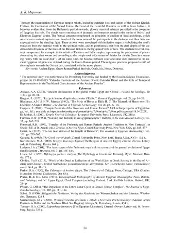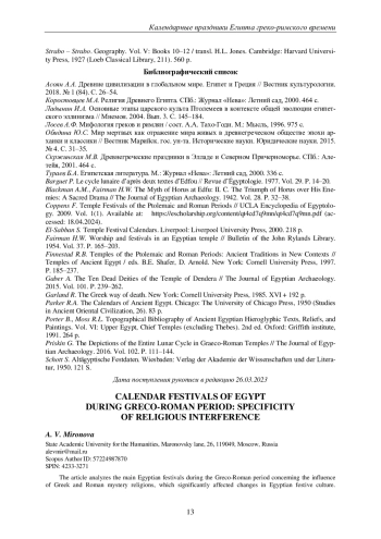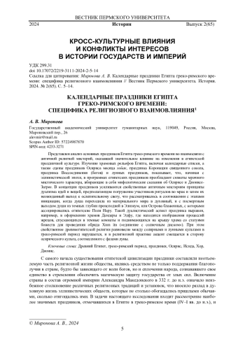 МИРОНОВА А. В. КАЛЕНДАРНЫЕ ПРАЗДНИКИ ЕГИПТА ГРЕКО-РИМСКОГО ВРЕМЕНИ: СПЕЦИФИКА РЕЛИГИОЗНОГО ВЗАИМОВЛИЯНИЯ // ВЕСТНИК ПЕРМСКОГО УНИВЕРСИТЕТА. ИСТОРИЯ. 2024. № 2 (65)