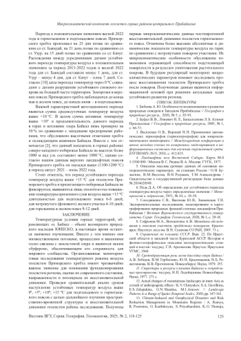 Целью исследования является выявление особенностей температурного режима верхних высотных поясов Приморского хребта (в т. ч. территорий, подверженных пирогенному воздействию) на фоне изменения температурных показателей предгорных территорий центрального Прибайкалья. Материалы и методы. В работе использованы данные метеорологического мониторинга с использованием автономных термографов Thermochron iButton DS1925L-F5 за 2021-2022 годы на трех площадках в северной части Приморского хребта, а также сведения сети Росгидромета (ст. Баяндай, Узур, Качуг). Результаты и обсуждение. Получены первые результаты мониторинговых наблюдений за температурой приземного слоя воздуха в верхних поясах Приморского хребта в 2021-2022 годах в сравнении с показателями на предгорных станциях. Определена годовая динамика температуры воздуха, рассчитаны суммы положительных температур и длительность безморозного периода для разных местоположений. Выводы. Среднегодовая температура воздуха в верхних поясах Приморского хребта имеет отрицательные значения -0,8-2,3 °С; она ниже по сравнению с окружающими предгорными ландшафтами; годовая амплитуда температуры воздуха также снижается в высокогорной части на 2,5-9 °С. Сроки перехода устойчивых температур воздуха через 0 °, +5 °; +10 °; +15 °С для подгольцового и горнотаежного поясов сходны, за исключением осеннего периода, когда переход ниже +5 °С в подгольцовом поясе осуществлялся на 19 дней раньше. Г ари характеризуются более высокими абсолютными и динамическими показателями температуры воздуха по сравнению с нетронутыми пожаром участками.