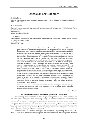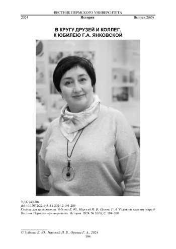 Статья, приуроченная к юбилею Галины Янковской, представляет собой коллаж разных по стилю и композиции фрагментов. Три автора используют дату в биографии историка как повод для размышлений о междисциплинарных направлениях в современной исторической науке, играют жанрами исторического повествования. Е. Ю. Зубкова делится своим видением развития историографической ситуации по истории позднего сталинизма, о перекличках в его интерпретации. И. В. Нарский вообразил сценарий разговора, который мог бы состояться между ним и Г. Янковской о ключевых проблемах визуального исторического исследования и новой культурной истории. Участники воображаемой дискуссии отталкиваются от обсуждения вышедших в 2007-2008 гг. монографий о советских художниках эпохи сталинизма и советской семейной фотопрактике, чтобы затронуть ряд волнующих их вопросов. Среди них - влияние развития страны в 1990-е гг. на траектории исследовательских интересов молодых российских историков, происхождение визуального поворота и его связь со смещением интереса историков с событий, структур и процессов на «обычного» человека, перспективы и трудности работы с изображением как историческим источником. Г. А. Орлова в первой части своего раздела ставит вопрос об экранной природе юбилея. Она контекстуализирует и проблематизирует утверждение юбиляра о том, что профессиональный историк должен усложнять картину мира. Во второй части результаты курирования биографической беседы с Галиной Янковской представлены в виде девяти тематических картин-эпизодов. Обсуждается специфика жизни на реке при позднем социализме и река как форма организации темпорального опыта историка.