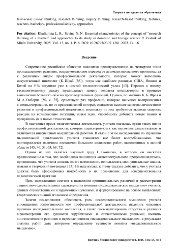 Введение. В настоящее время все большее внимание уделяется развитию когнитивных способностей учащихся. Когнитивные способности играют важную роль в различных сферах жизни, включая образование, профессиональную деятельность, спорт и даже повседневные задачи. Понимание сущности когнитивных способностей и их развитие необходимо для нашего личностного и профессионального роста. Одной из важнейших когнитивных способностей будущего учителя в настоящее время является исследовательское мышление. Статья посвящена изучению сущностных характеристик понятия «исследовательское мышление» учителя и хронологии его развития в отечественной и зарубежной педагогике.