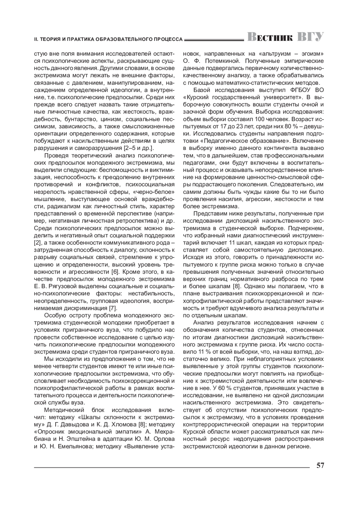 2. Шиповская В. В. Психологические факторы риска экстремистской активности личности в молодежной среде / В. В. Шиповская, А. Ш. Гусейнов // Гуманизация образования. - 2019. - № 5. -С. 180-195. DOI: 10.24411/1029-3388-2019-10062 EDN: VAFVDT