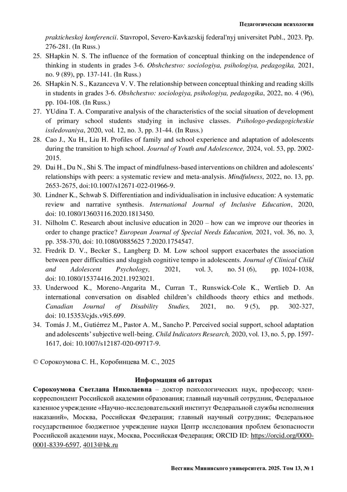10. Кисова В. В., Карпушкина Н. В., Конева И. А. Экспериментальное формирование межличностных отношений со сверстниками у подростков с задержкой психического развития // Проблемы современного педагогического образования. 2024. № 84-4. С. 379-382.