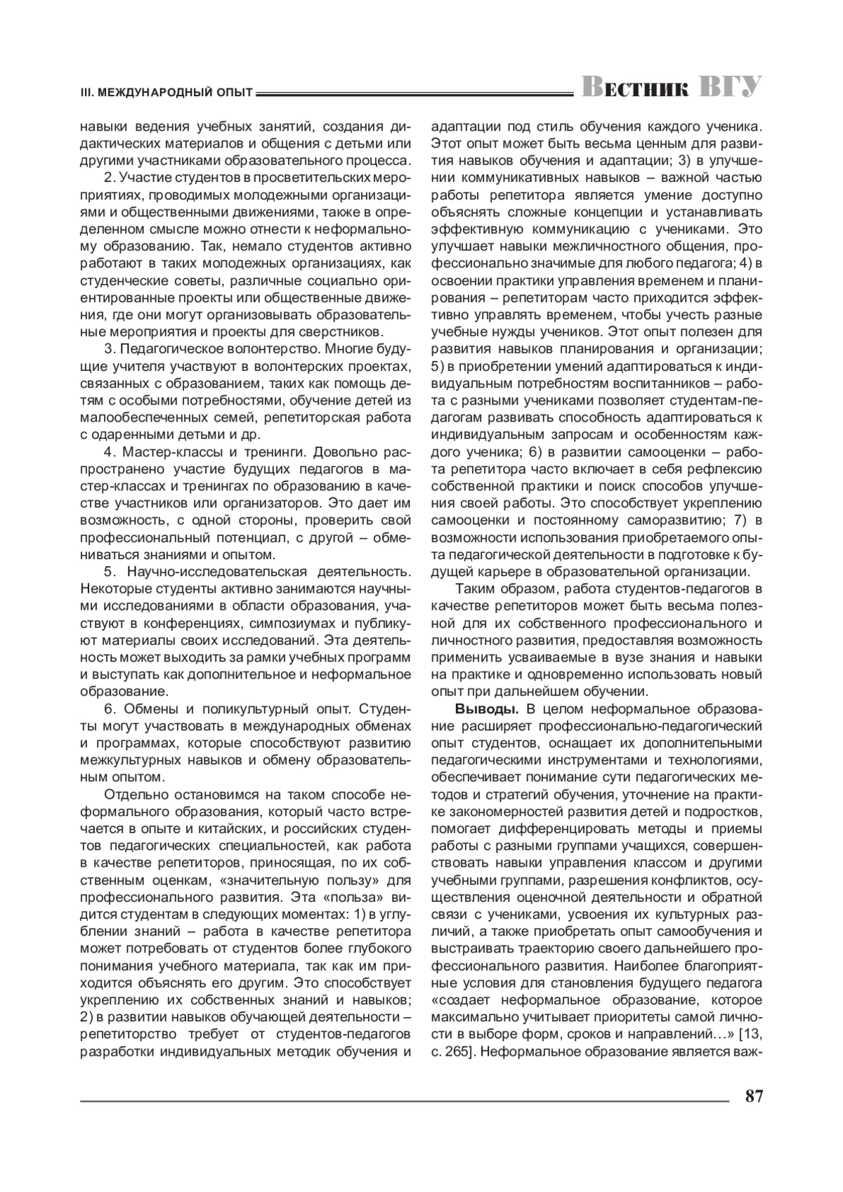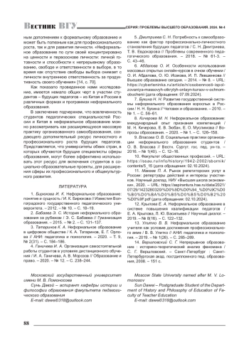 СУНЬ Д. УЧАСТИЕ СТУДЕНТОВ ПЕДАГОГИЧЕСКИХ СПЕЦИАЛЬНОСТЕЙ РОССИИ И КИТАЯ В НЕФОРМАЛЬНОМ ОБРАЗОВАНИИ // ВЕСТНИК ВОРОНЕЖСКОГО ГОСУДАРСТВЕННОГО УНИВЕРСИТЕТА. СЕРИЯ: ПРОБЛЕМЫ ВЫСШЕГО ОБРАЗОВАНИЯ. 2024. № 4