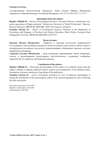 10. Басимов М. М. «Значимая» корреляция и реальная типология зависимостей в рамках показателей популярных психодиагностических методик (расчет по 9 тестам) // Вестник Мининского университета. 2024. Т. 12, № 1 (46). С. 6. https://doi.org/10.26795/2307-1281-2024-12-1-6.
