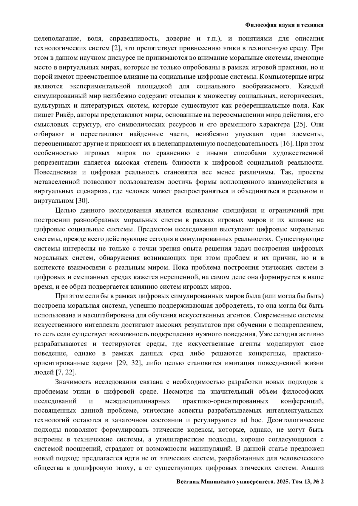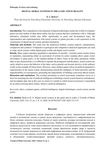 Введение. Всеобъемлющее развитие цифровых технологий делает миры компьютерных игр не только моделями представлений о реальности, но и системами, обладающими с ней сходством. Хотя альтернативные симулированные миры могут значительно отличаться целями и логикой развития, репрезентация и экспериментирование с моральными системами в играх представляет богатый опыт построения цифровых моральных систем и их ограничений.