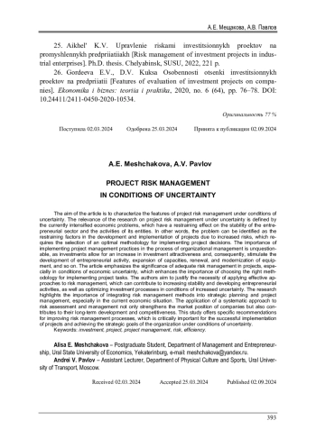 25. Айхель, К.В. Управление рисками инвестиционных проектов на промышленных предприятиях: дис.. канд. экон. наук: 08.00.05 / К.В. Айхель; Юж.-Ур. гос. ун-т. - Челябинск, 2022. - 221 с.