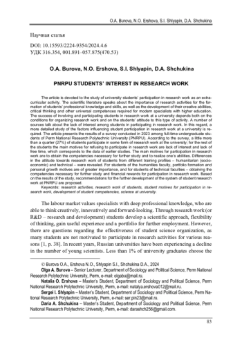 Статья посвящена изучению участия студентов вузов в научно-исследовательской работе как внеучебной деятельности (сверх учебного плана). В научной литературе говорится о важности научно-исследовательской деятельности для формирования профессиональных знаний, умений и навыков студентов, а также развития их творческих способностей, критического мышления и других универсальных компетенций, необходимых современному специалисту с высшим образованием. Успешность вовлечения и участия студентов в научно-исследовательской работе в вузе зависит как от условий организации НИРС, так и от отношения самих студентов к этому виду деятельности. В ряде источников говорится о недостаточной заинтересованности студентов в участии в НИР. В связи с этим требуется более подробное изучение факторов, влияющих на участие студентов в научно-исследовательской работе в вузе. В статье представлены результаты опроса, проведенного в 2023 г. среди студентов бакалавриата дневного отделения Пермского национального исследовательского политехнического университета (ПНИПУ). По результатам опроса, немногим более четверти (27 %) студентов участвуют в тех или иных формах НИР в вузе, для остальных студентов основными мотивами отказа от участия в НИР являются отсутствие интереса и отсутствие свободного времени, что соответствует данным ранее проведенных исследований. Основными мотивами участия в НИР являются получение компетенций, необходимых для дальнейшей учебы, и реализация своих способностей. Выявлены различия в отношении к НИР студентов разных профилей обучения - гуманитарного (социально-экономического) и технического. Для студентов гуманитарного факультета большее значение имеют формирование портфолио и мотивы личностного роста, а для студентов технических факультетов - получение компетенций, необходимых для дальнейшей учебы, и материальное вознаграждение за участие в НИР. На основе результатов исследования предложены рекомендации по дальнейшему развитию системы научно-исследовательской работы студентов в ПНИПУ.