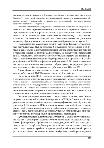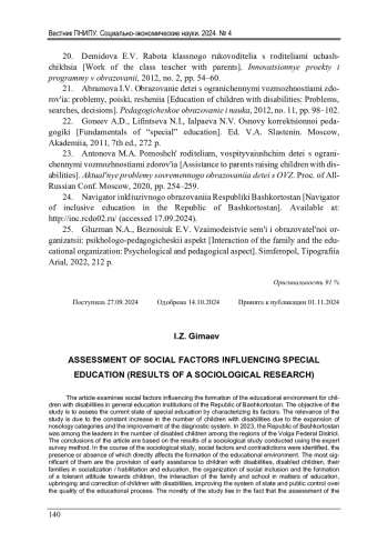 Рассматриваются социальные факторы, оказывающие влияние на формирование образовательной среды для детей с ограниченными возможностями здоровья и с инвалидностью в общеобразовательных учреждениях Республики Башкортостан. Задача исследования - дать оценку современного состояния специального образования через характеристику ее факторов. Актуальность исследования обусловлена постоянным ростом числа детей с ограниченными возможностями здоровья и с инвалидностью за счет расширения категорий нозологии и совершенствования системы диагностирования. В 2023 г. Республика Башкортостан оказалась в числе лидеров по количеству детей-инвалидов среди регионов Приволжского федерального округа. Выводы базируются на результатах социологического исследования, проведенного методом экспертного опроса. В ходе социологического исследования были выявлены социальные факторы и противоречия, наличие или отсутствие которых непосредственным образом оказывает влияние на формирование образовательной среды. Наиболее значимые из них - оказание ранней помощи детям с ограниченными возможностями здоровья, детям-инвалидам, их семьям в социализации/абилитации и получении образования, организация социальной инклюзии и формирование толерантного отношения к детям, взаимодействие семьи и школы в вопросах обучения, воспитания и коррекции детей с ограниченными возможностями здоровья и с инвалидностью, совершенствование системы государственного и общественного контроля качества образовательного процесса. Новизна исследования заключается в том, что оценка социальных факторов специального образования проведена экспертами - педагогами и специалистами интегрированного и инклюзивного образования. В ходе исследования экспертами дана оценка противоречий, существующих в организации педагогического процесса.