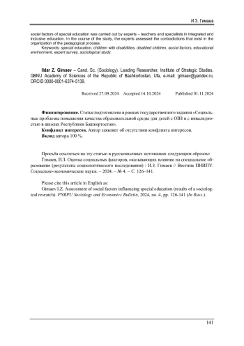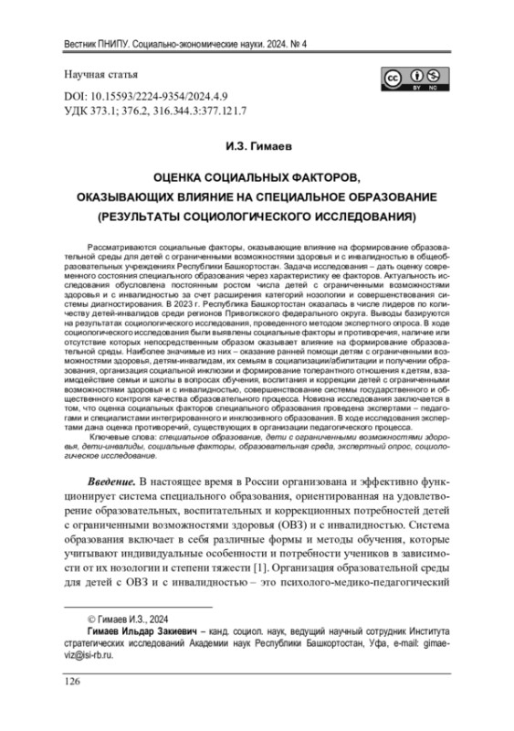ГИМАЕВ И. З. ОЦЕНКА СОЦИАЛЬНЫХ ФАКТОРОВ, ОКАЗЫВАЮЩИХ ВЛИЯНИЕ НА СПЕЦИАЛЬНОЕ ОБРАЗОВАНИЕ (РЕЗУЛЬТАТЫ СОЦИОЛОГИЧЕСКОГО ИССЛЕДОВАНИЯ) // ВЕСТНИК ПЕРМСКОГО НАЦИОНАЛЬНОГО ИССЛЕДОВАТЕЛЬСКОГО ПОЛИТЕХНИЧЕСКОГО УНИВЕРСИТЕТА. СОЦИАЛЬНО-ЭКОНОМИЧЕСКИЕ НАУКИ. 2024. № 4