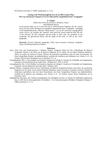 В этой статье рассматривается взгляд на мир стихоплокоса Кайсариоса Дапонтеса 18-го века. В частности, в его неопубликованном стихотворении “География”, которое взято из также неопубликованного сборника “Андентес вразумительно”, затрагиваются вопросы географического характера, такие как, например, “материал”, из которого была построена Земля, и ее создатель, размеры Вселенной, пять континентов и богатства их территорий, парадоксы континентов, геоцентрическая теория и форма земли, “политика”, наконец, география.
