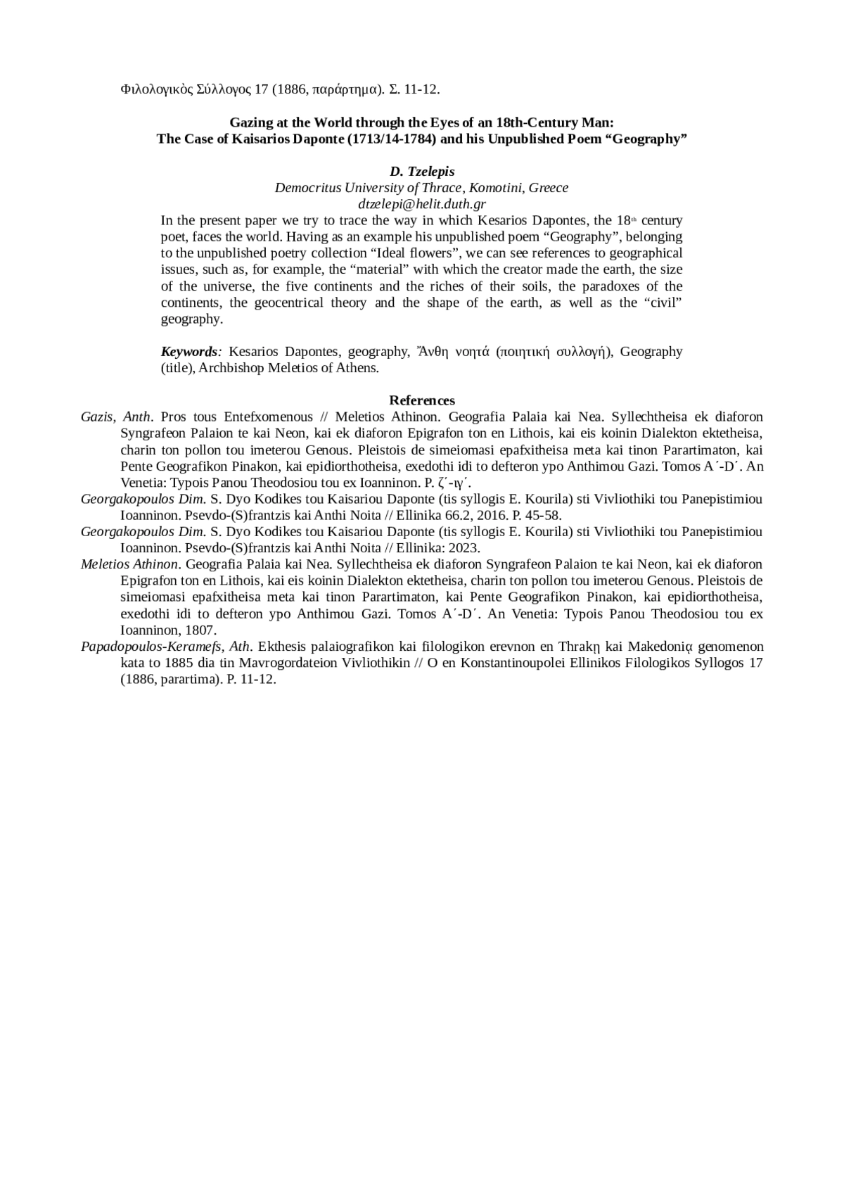 ΤΖΕΛΈΠΗΣ Δ. СМОТРЮ НА МИР ГЛАЗАМИ ЧЕЛОВЕКА 18 ВЕКА: СЛУЧАЙ С ЦЕЗАРИУСОМ ДАПОНТЕ (1713/14-1784) И ЕГО НЕОПУБЛИКОВАННОЙ ПОЭМОЙ "ГЕОГРАФИЯ" // КАФЕДРА ВИЗАНТИЙСКОЙ И НОВОГРЕЧЕСКОЙ ФИЛОЛОГИИ. 2025. ТОМ 1, № 21