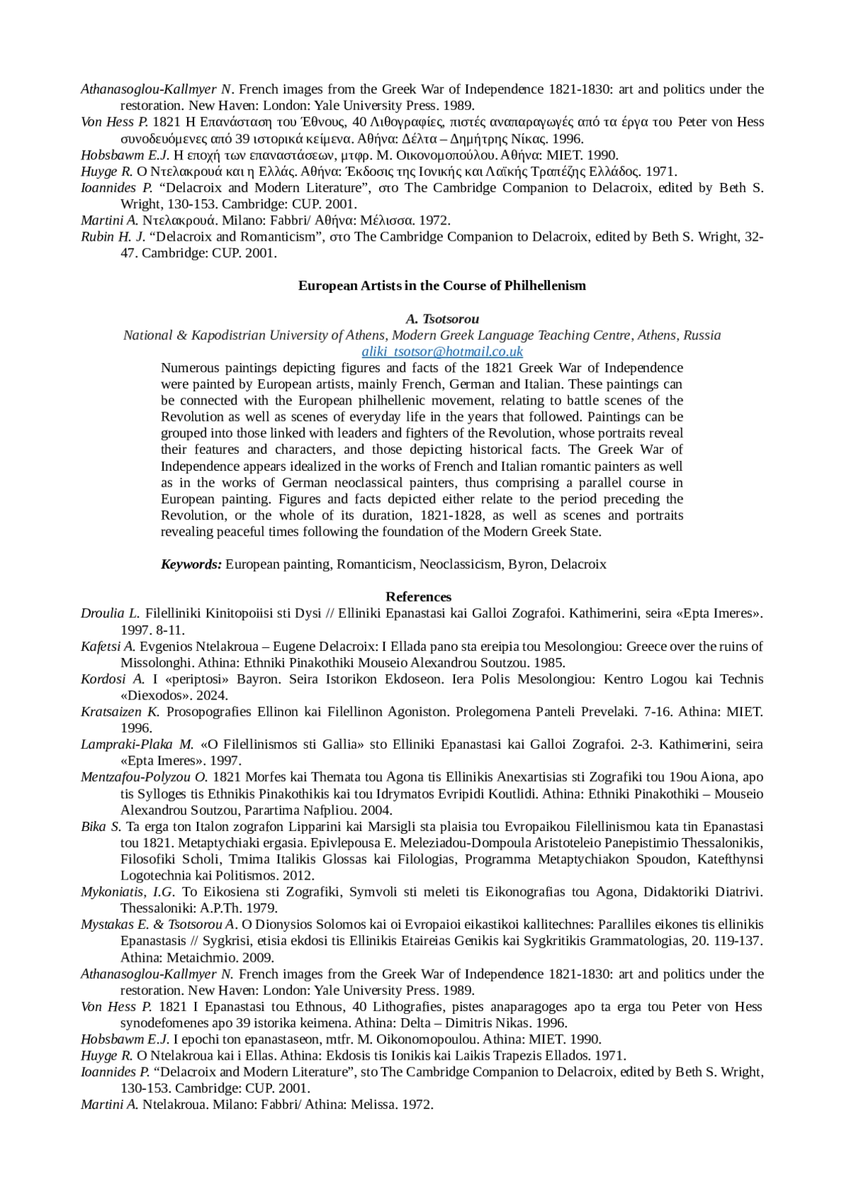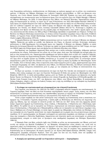 Многочисленные работы, изображающие людей и события греческой революции 1821 года, были созданы европейскими художниками, в основном французскими, немецкими и итальянскими. Работы связаны с эллинистическим движением в Европе и изображают моменты драматической интенсивности боевых действий, а также мирные моменты жизни после революции. Работы делятся на две категории: те, которые связаны с лидерами и бойцами, что придает им особые черты, и те, которые представляют собой изображения исторических событий. Идеализация греческой революции художниками французского и итальянского романтических течений, а также немецкого неоклассицизма представляет собой параллельное направление европейского художественного творчества, отражающее как события, предшествовавшие освободительной борьбе, так и события и личностей, стоявших у истоков революции 1821-1828 годов. в виде сцен и портретов, которые подчеркивают мирный ритм жизни после основания нового греческого государства.
