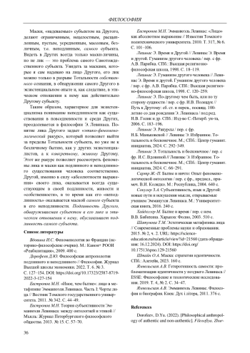 4. Евстропов М.Н. Теория субъективности Эмманюэля Левинаса: между онтологией и этикой // Мысль: Журнал Петербургского философского общества. 2013. № 15. C. 57-70. EDN: SMFMEX