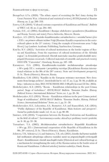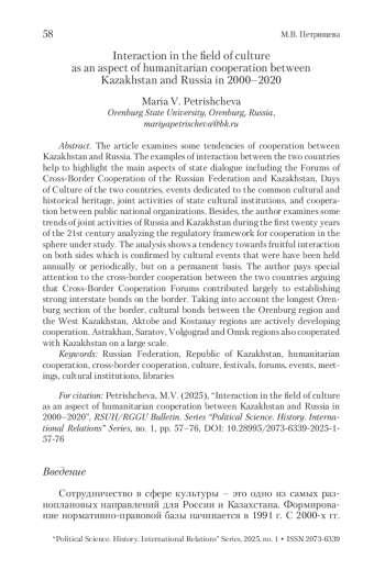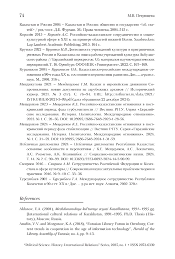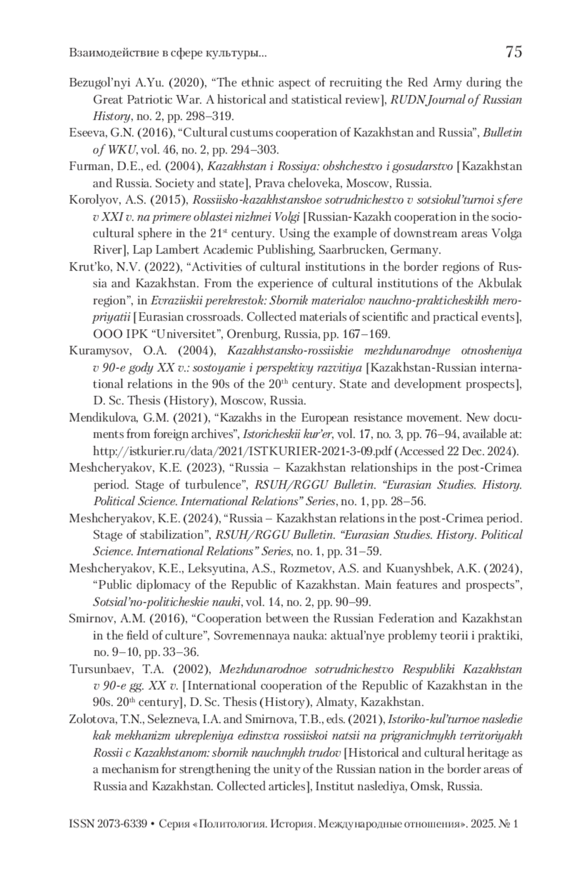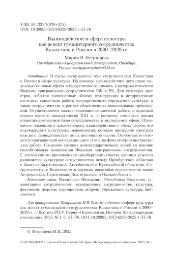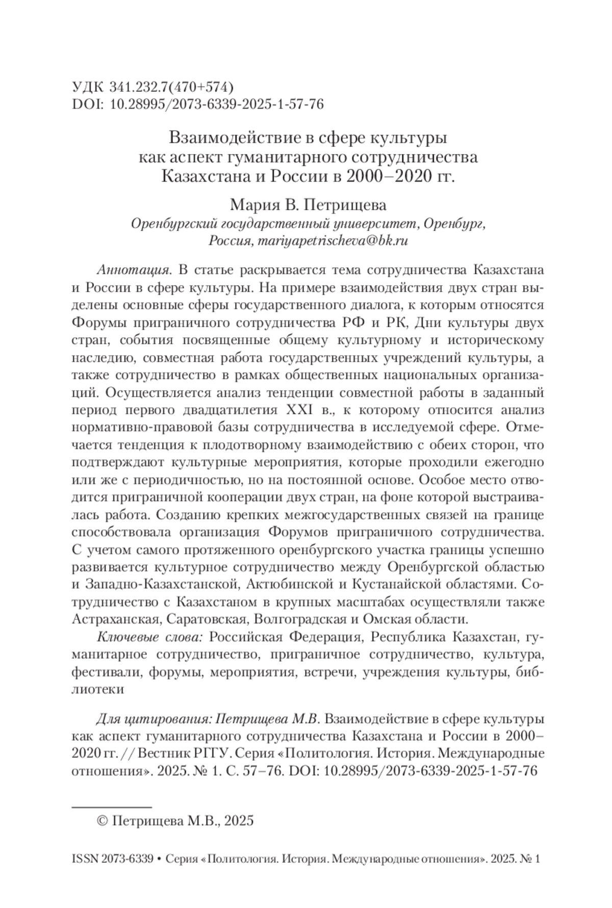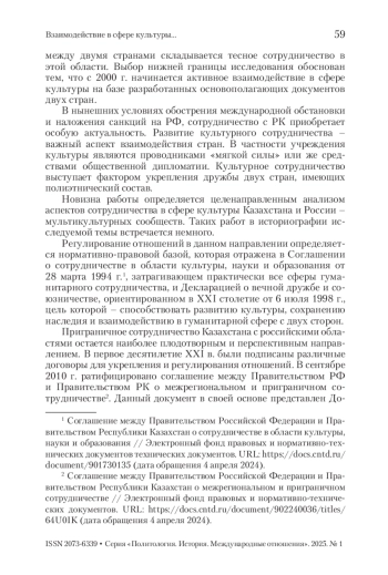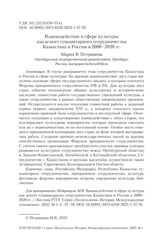 ПЕТРИЩЕВА М. В. ВЗАИМОДЕЙСТВИЕ В СФЕРЕ КУЛЬТУРЫ КАК АСПЕКТ ГУМАНИТАРНОГО СОТРУДНИЧЕСТВА КАЗАХСТАНА И РОССИИ В 2000–2020 ГГ. // ВЕСТНИК РГГУ. СЕРИЯ: ПОЛИТОЛОГИЯ. ИСТОРИЯ. МЕЖДУНАРОДНЫЕ ОТНОШЕНИЯ. 2025. № 1