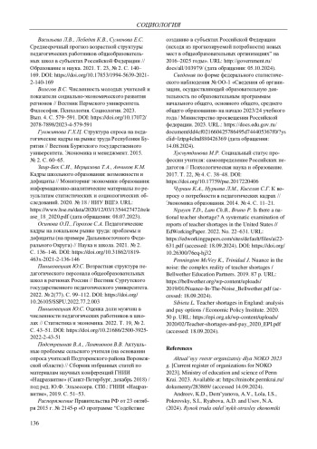 Статья посвящена анализу показателей воспроизводства кадровой структуры в системе общего образования. Авторы обращают внимание на формирование валидных и адекватных показателей, характеризующих процесс воспроизводства педагогических кадров на уровне образования. Важность подобных данных обосновывается нарастанием кадровой напряженности, характерной для отечественно рынка труда, а также фиксируемом росте среднего возраста педагогических работников и росте числа вакантных ставок. На основании анализа сложившихся в научной практике эмпирических подходов авторы делаю вывод о наличии серьезных различий в воспроизводстве учительских кадров в различных территориальных условиях, в первую очередь - разнице между городскими и сельскими школами, а также между школами, расположенными в районах с различными экономическими условиями. Для уточнения структуры педагогических кадров в статье используется несколько источников, включая данные официального статистического наблюдения Министерства просвещения РФ, а также данные контент-анализа сайтов образовательных организаций Пермского края, содержащие сведения о кадровом составе. Сопоставление данных, полученных из указанных источников, показало, что наиболее существенные различия в структуре педагогических кадров определяются не типом населенного пункта, в котором расположена школа, а расположением школы в региональной столице или вне ее. Так, школы, расположенные в г. Перми, существенно отличаются по средней величине педагогического стажа и большей доле педагогов со стажем до 5 лет. Более того, именно в этих школах чаще используется практика привлечения сотрудников без профильного педагогического образования. Еще один вывод, сделанный в статье, касается необходимости расширения диапазона педагогического стажа, используемого в статистических наблюдениях, т. к. установленная планка в 20 и более лет не отражает реального распределения и показатели центральной тенденции.