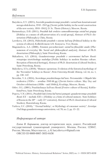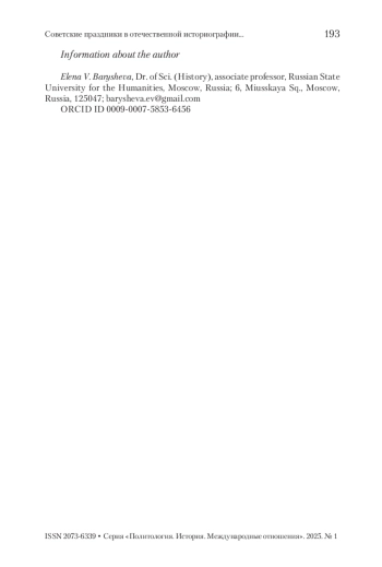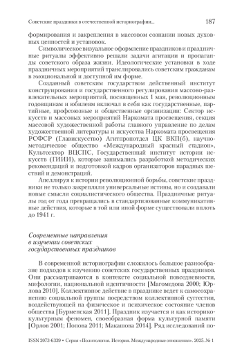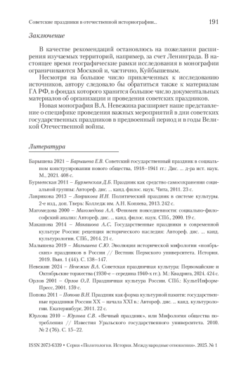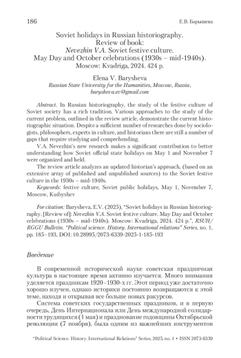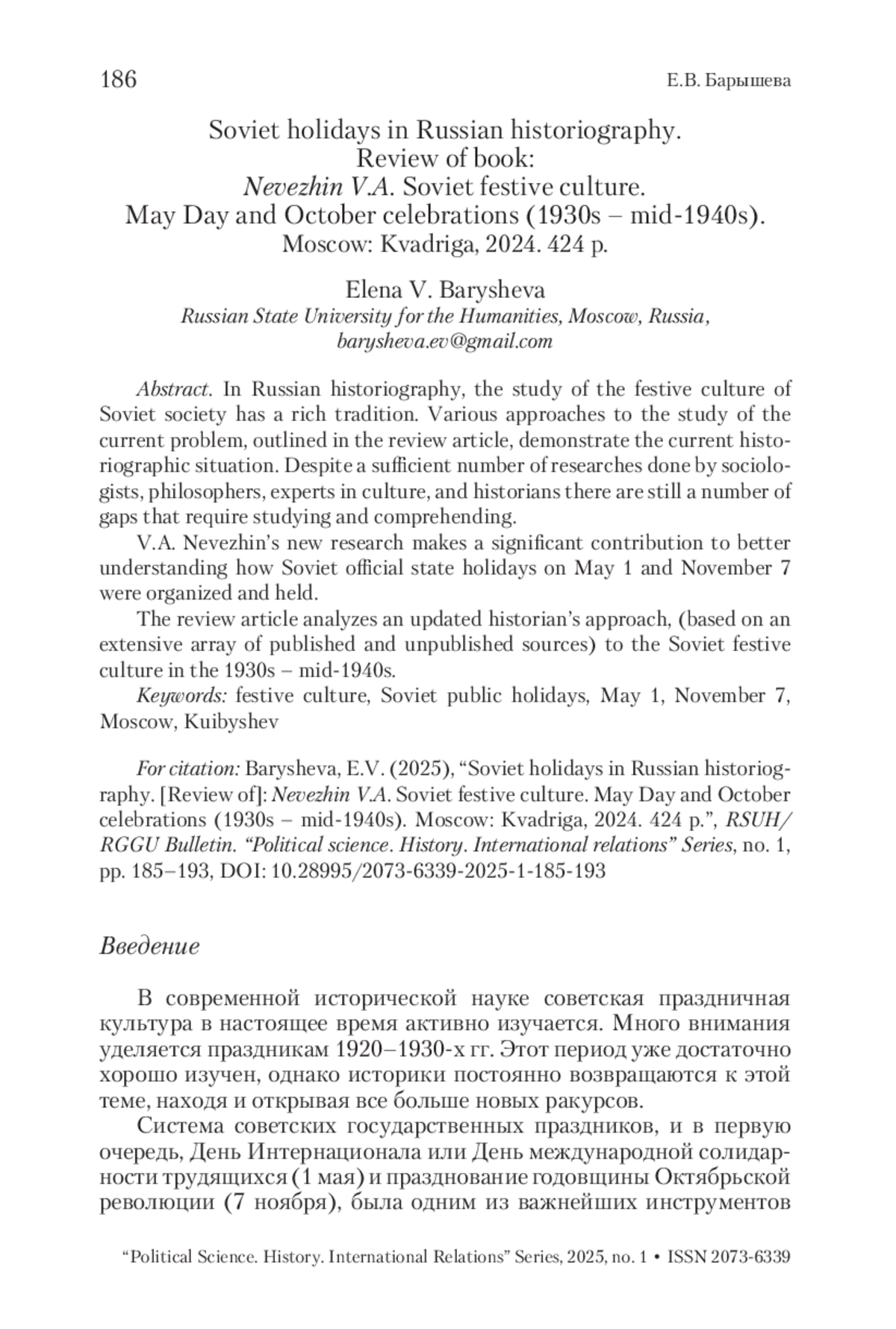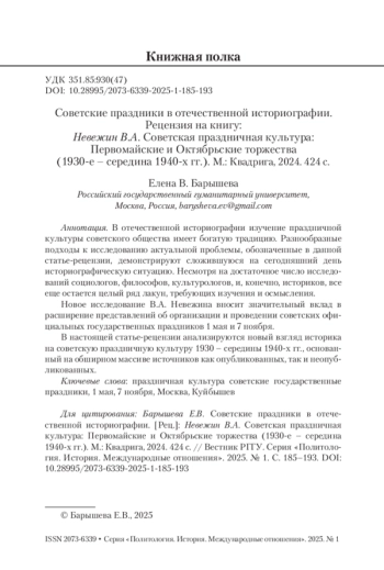 БАРЫШЕВА Е. В. СОВЕТСКИЕ ПРАЗДНИКИ В ОТЕЧЕСТВЕННОЙ ИСТОРИОГРАФИИ. РЕЦЕНЗИЯ НА КНИГУ: НЕВЕЖИН В. А. СОВЕТСКАЯ ПРАЗДНИЧНАЯ КУЛЬТУРА: ПЕРВОМАЙСКИЕ И ОКТЯБРЬСКИЕ ТОРЖЕСТВА (1930-Е – СЕРЕДИНА 1940-Х ГГ.). М.: КВАДРИГА, 2024. 424 С. // ВЕСТНИК РГГУ. СЕРИЯ: ПОЛИТОЛОГИЯ. ИСТОРИЯ. МЕЖДУНАРОДНЫЕ ОТНОШЕНИЯ. 2025. № 1