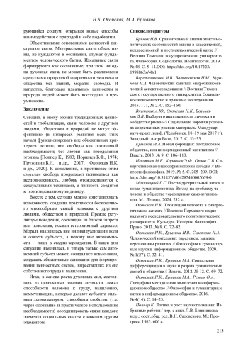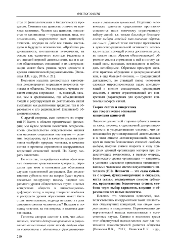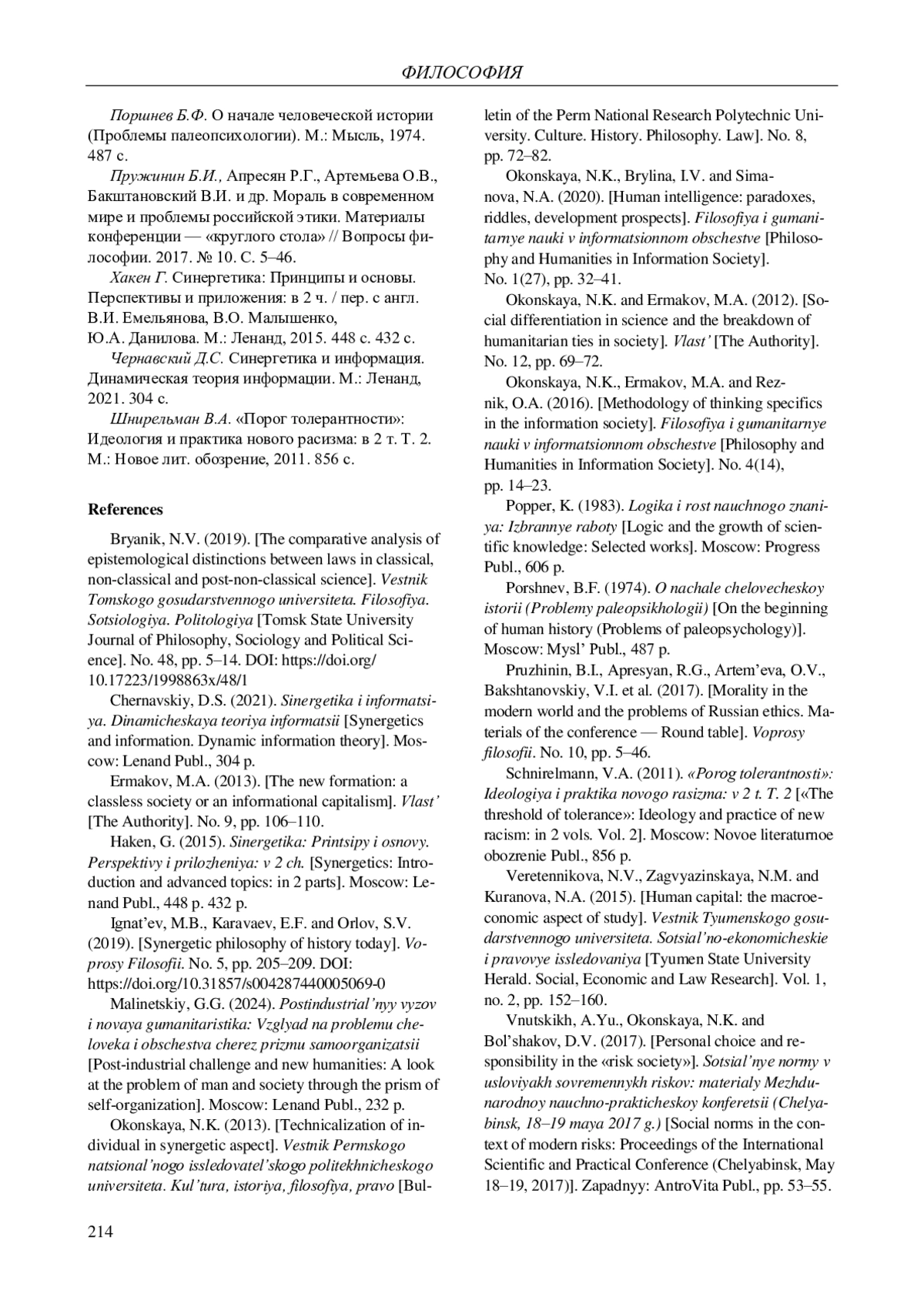 7. Оконская Н.К. Технизация человека в синергетическом аспекте // Вестник Пермского национального исследовательского политехнического университета. Культура. История. Философия. Право. 2013. № 8. С. 72-82.