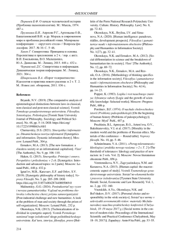 10. Оконская Н.К., Ермаков М.А., Резник О.А. Специфика методологии мышления в информационном обществе // Философия и гуманитарные науки в информационном обществе. 2016. № 4(14). С. 14-23. EDN: XIIPBJ
