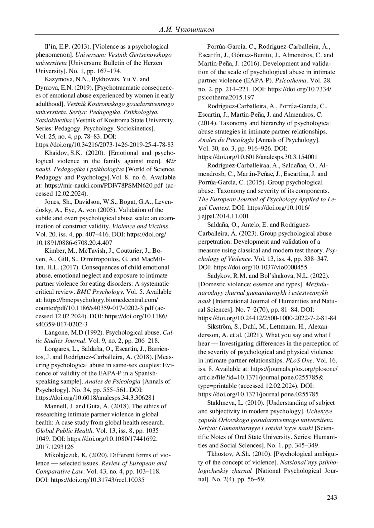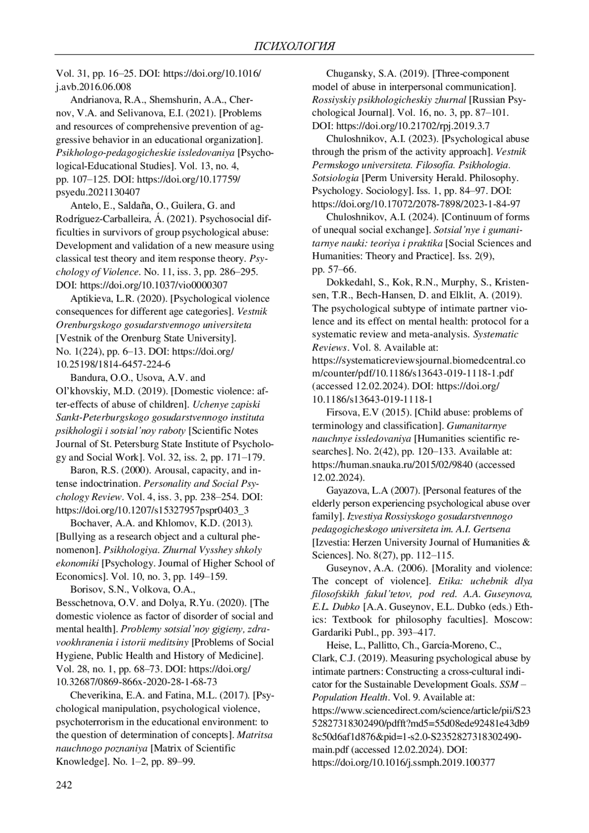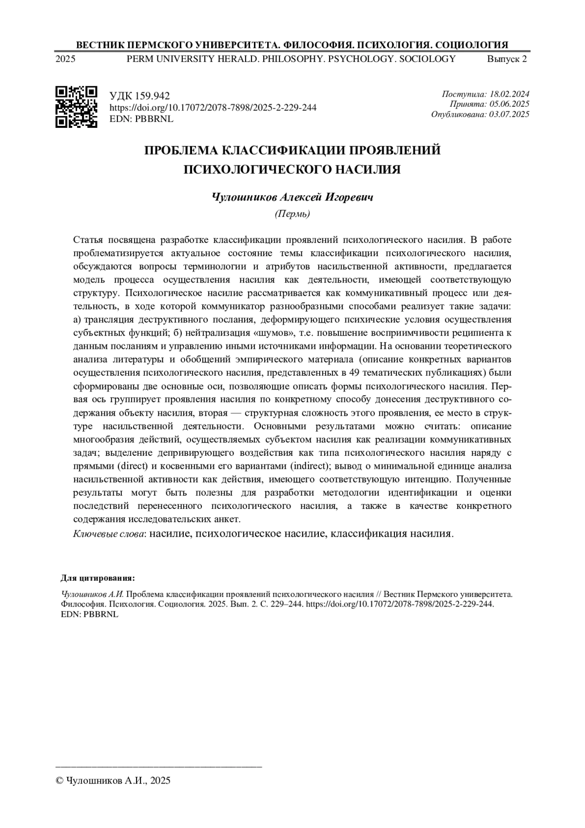 20. Чулошников А.И. Психологическое насилие сквозь призму деятельностного подхода // Вестник Пермского университета. Философия. Психология. Социология. 2023. Вып. 1. С. 84-97. DOI: 10.17072/2078-7898/2023-1-84-97 EDN: EHCTEB