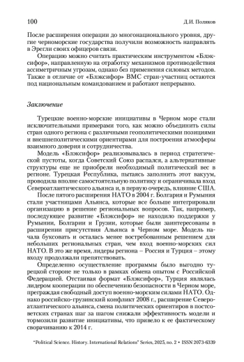 Стратегический вакуум после распада Советского Союза стал причиной появления альтернативных инициатив по поддержанию стабильности и мира в Черноморском регионе. В статье рассматривается уникальная модель сотрудничества «Блэксифор», учрежденная соглашением о создании Черноморской военно-морской группы оперативного взаимодействия, и операция «Черноморская гармония», направленная на сдерживание терроризма и асимметричных угроз в регионе. Прежде всего акцент делается на истории создания модели, ее цели, задачах и той роли, которую играла «Блэксифор» в системе региональной безопасности и межнациональном взаимодействии. Предпринята попытка объяснить практические механизмы военно-морской кооперации, а также причин сворачивания инициативы и роли Турецкой Республики. Делается вывод, что модель стала исключительным примером того, как можно объединить военно-морские силы стран одного региона с различными геополитическими позициями и внешнеполитическими ориентирами для построения атмосферы взаимного доверия и сотрудничества. Однако, после пятого расширения НАТО развитие «Блэксифор» не находило поддержки у Румынии, Болгарии и Грузии, которые были заинтересованы в присутствии военно-морских сил Альянса в Черном море, чему продолжали препятствовать Российская Федерация и Турция.