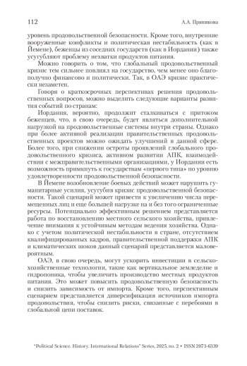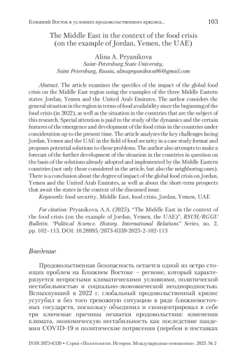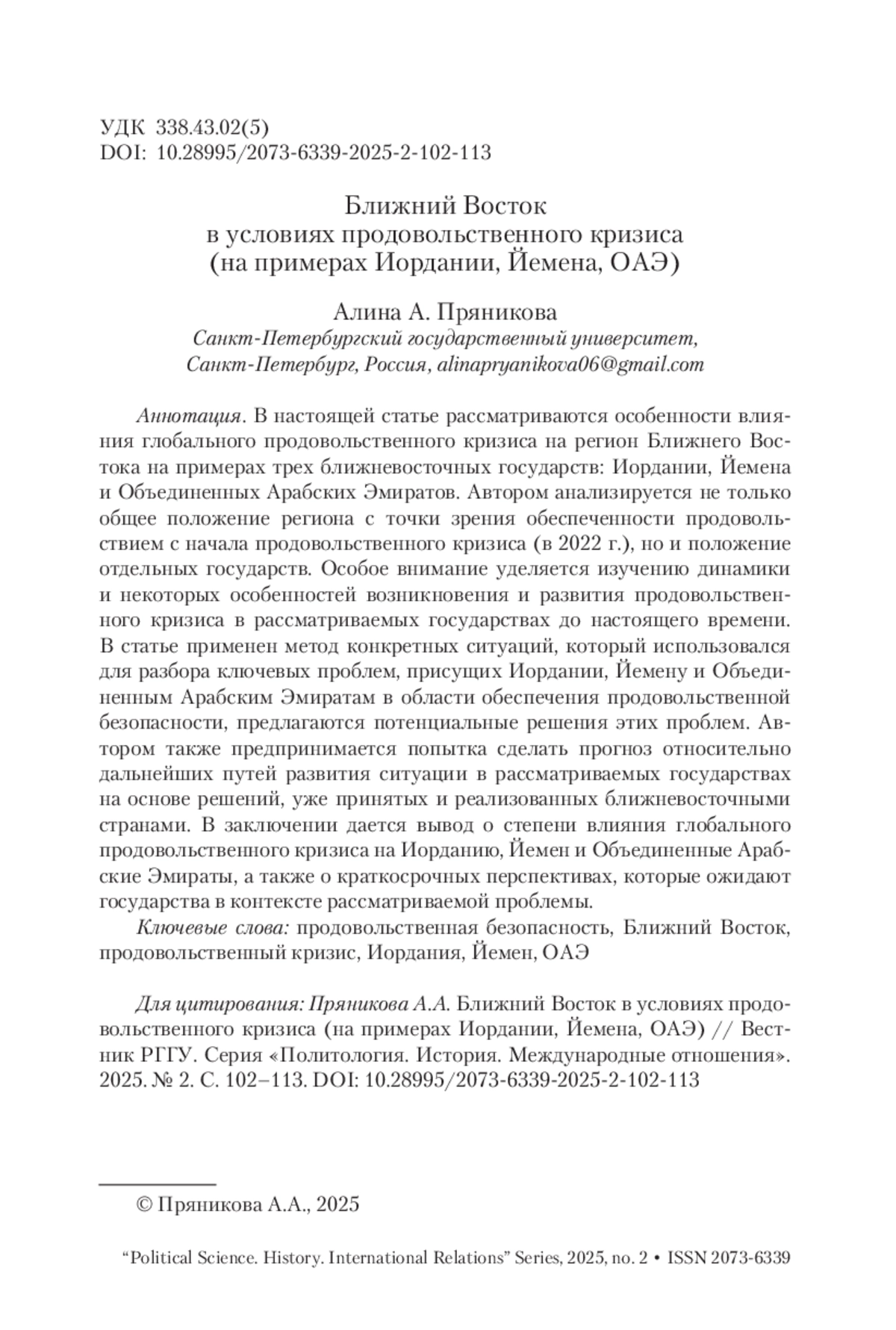 В настоящей статье рассматриваются особенности влияния глобального продовольственного кризиса на регион Ближнего Востока на примерах трех ближневосточных государств: Иордании, Йемена и Объединенных Арабских Эмиратов. Автором анализируется не только общее положение региона с точки зрения обеспеченности продовольствием с начала продовольственного кризиса (в 2022 г.), но и положение отдельных государств. Особое внимание уделяется изучению динамики и некоторых особенностей возникновения и развития продовольственного кризиса в рассматриваемых государствах до настоящего времени. В статье применен метод конкретных ситуаций, который использовался для разбора ключевых проблем, присущих Иордании, Йемену и Объединенным Арабским Эмиратам в области обеспечения продовольственной безопасности, предлагаются потенциальные решения этих проблем. Автором также предпринимается попытка сделать прогноз относительно дальнейших путей развития ситуации в рассматриваемых государствах на основе решений, уже принятых и реализованных ближневосточными странами. В заключении дается вывод о степени влияния глобального продовольственного кризиса на Иорданию, Йемен и Объединенные Арабские Эмираты, а также о краткосрочных перспективах, которые ожидают государства в контексте рассматриваемой проблемы.