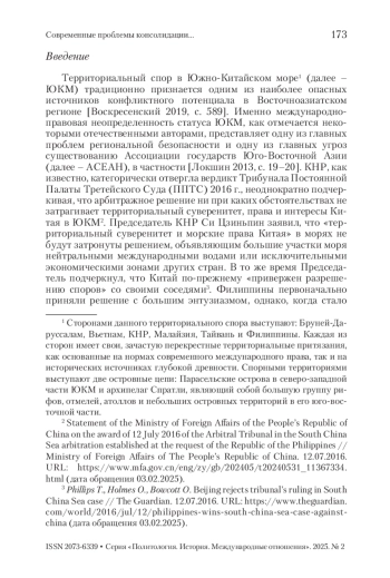В исследовании анализируются современные проблемы и перспективы консолидации политико-правовых позиций АСЕАН и России в отношении территориального спора в Южно-Китайском море. На основе анализа совокупности материалов политических заявлений представителей сторон спора, международных договоров и материалов СМИ выявлено, что представители Индонезии, Филиппин и Вьетнама указывают на необходимость скорейшей выработки юридически обязательного Кодекса поведения сторон в Южно-Китайском море, будучи единогласными в необходимости урегулирования спора в соответствии с существующими нормами международного морского права. Позиция Китая остается политически неоднозначной и амбивалентной в отношении потенциального договорного урегулирования.