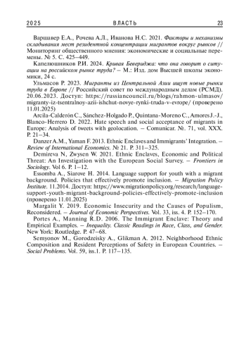 2. Варшавер Е.А., Рочева А.Л., Иванова Н.С. 2021. Факторы и механизмы складывания мест резидентной концентрации мигрантов вокруг рынков // Мониторинг общественного мнения: экономические и социальные перемены. № 5. С. 425-449. EDN: MPVWAX