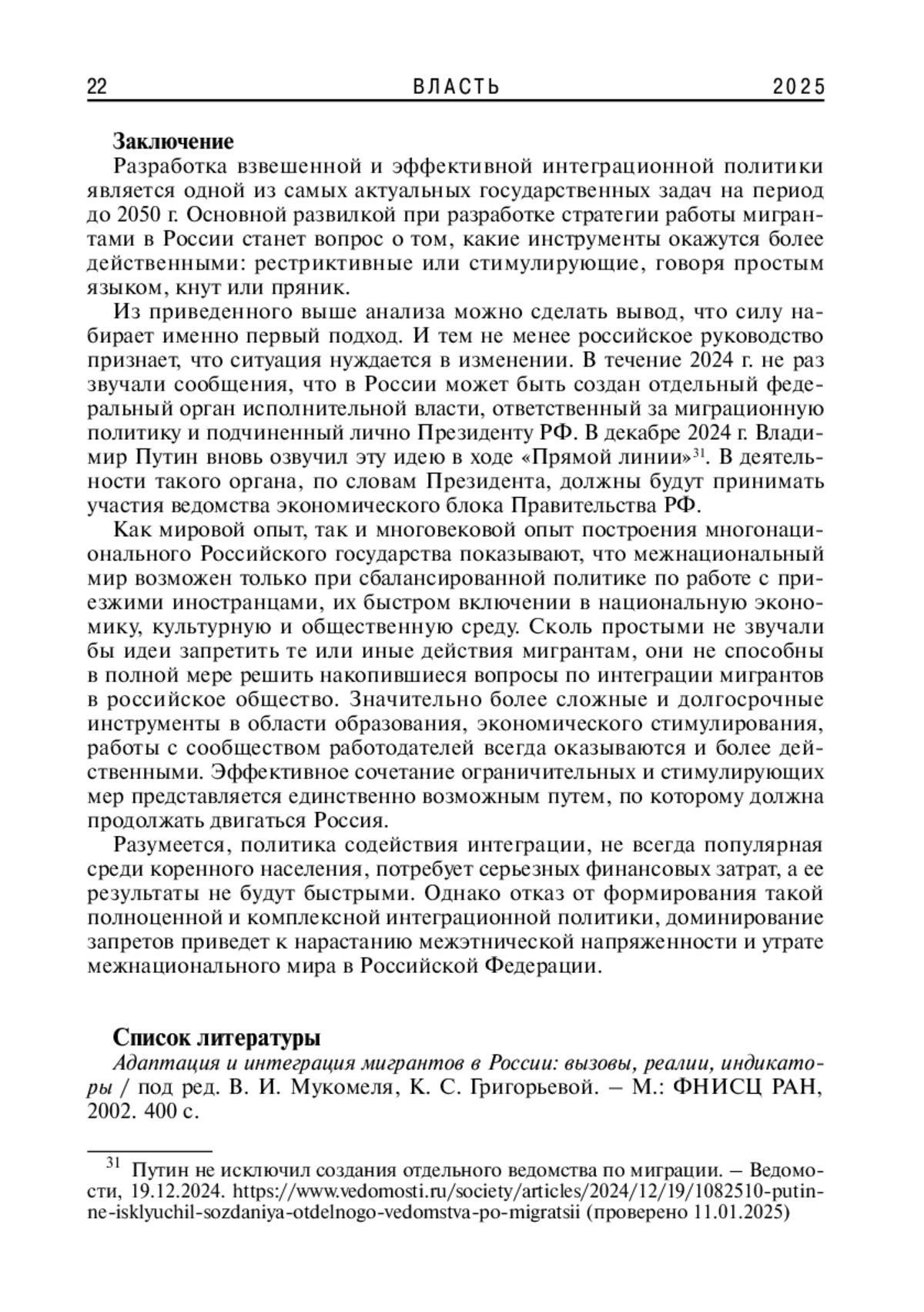 1. Адаптация и интеграция мигрантов в России: вызовы, реалии, индикаторы / под ред. В. И. Мукомеля, К. С. Григорьевой. - М.: ФНИСЦ РАН, 2002. 400 с.