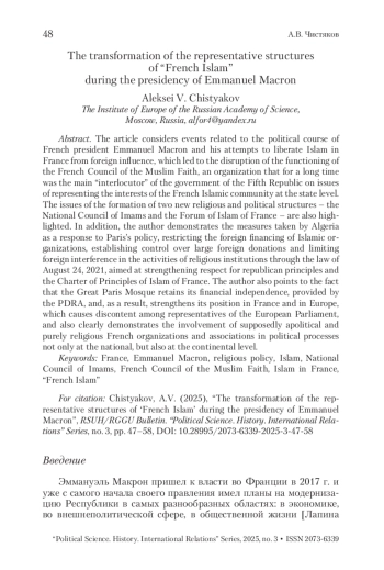 В настоящей статье рассматриваются события, связанные с политическим курсом, реализуемым президентом Эммануэлем Макроном в рамках его стремления освободить ислам во Франции от иностранного влияния, результатом которого стало нарушение функционирования Французского совета мусульманского вероисповедания, долгое время являвшегося основным «собеседником» правительства Пятой Республики по вопросам представления интересов мусульманского сообщества Франции на государственном уровне. Также освещаются вопросы формирования двух новых религиозно-политических структур – Национального совета имамов и Форума ислама Франции. Кроме того, автором демонстрируются меры, принимаемые Алжиром в качестве ответа на реализуемую Парижем политику по ограничению иностранного финансирования исламских организаций, устанавливающую контроль за иностранными пожертвованиями (и ограничивающую вмешательство иностранцев в деятельность религиозных учреждений) на основе закона от 24 августа 2021 г., направленного на укрепление уважения республиканских принципов и Хартии принципов ислама Франции. Приводятся факты, указывающие на сохранение Большой парижской мечетью своей финансовой независимости, обеспечиваемой АНДР, и, как следствие, укрепление ее позиций во Франции и в Европе, что вызывает недовольство представителей Европейского парламента, а также наглядно демонстрирует вовлеченность якобы аполитичных и сугубо религиозных французских организаций и объединений в политические процессы не только на национальном, но уже и на континентальном уровне.