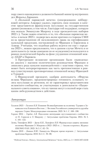 2. Гордон 2024 - Гордон А.В. Идеология интеграции мусульманского сообщества от Н. Саркози к Э. Макрону // Актуальные проблемы Европы. 2024. № 3. С. 101-122.