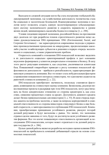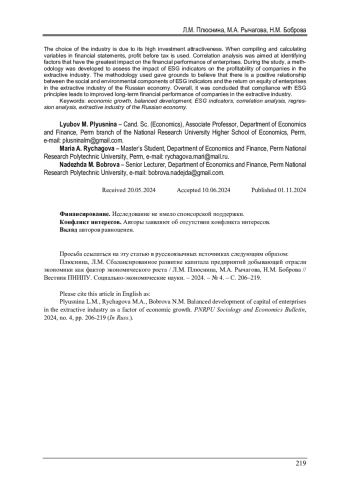 Анализируется взаимосвязь между показателями экономической эффективности деятельности предприятий добывающей отрасли экономики России и факторами сбалансированного развития. Добывающая отрасль до сих пор остается основополагающей отраслью при формировании ВВП страны. Информационной базой исследования выступили ESG-показатели предприятий добывающей отрасли, по которым можно судить о степени сбалансированного развития экономики. В качестве инструментов, способных определить взаимосвязи между элементами системы, использовались корреляционный анализ и регрессионный анализ. Исследования проводились с использованием программы «Gretl». В качестве независимых переменных выступили коэффициенты раскрытия ESG-факторов: экологических, социальных факторов, а также факторов корпоративного управления. В качестве контрольных переменных были использованы: размер компании, коэффициент оборачиваемости активов, коэффициент финансового рычага и темп прироста активов. Из добывающей отрасли в выборку вошли 19 предприятий. Выбор отрасли обусловлен ее высокой инвестиционной привлекательностью. При составлении и расчете переменных в финансовой отчетности используется прибыль до налогообложения. Корреляционный анализ был нацелен на выявление факторов, имеющих наибольшее влияние на финансовые результаты деятельности предприятий. В ходе исследования была разработана методика оценки влияния ESG-показателей на прибыльность компаний добывающей отрасли. Применяемая методика дала основание полагать о существовании положительной взаимосвязи социальной и экологической составляющих ESG-показателей и рентабельности собственного капитала предприятий добывающей отрасли экономики России. В целом был сделан вывод о том, что соблюдение ESG-принципов приводит в долгосрочном плане к повышению финансовых показателей компаний добывающей отрасли.