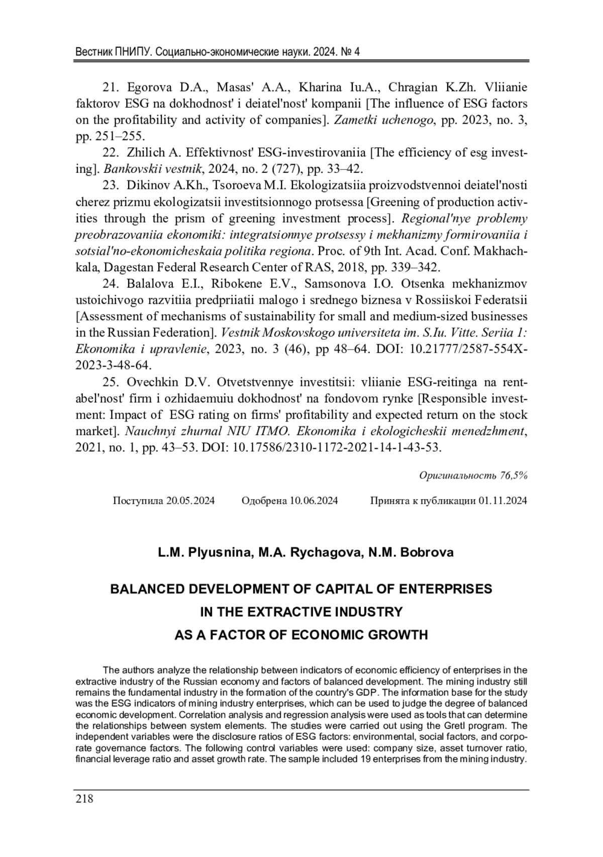 ПЛЮСНИНА Л. М., РЫЧАГОВА М. А., БОБРОВА Н. М. СБАЛАНСИРОВАННОЕ РАЗВИТИЕ КАПИТАЛА ПРЕДПРИЯТИЙ ДОБЫВАЮЩЕЙ ОТРАСЛИ ЭКОНОМИКИ КАК ФАКТОР ЭКОНОМИЧЕСКОГО РОСТА // ВЕСТНИК ПЕРМСКОГО НАЦИОНАЛЬНОГО ИССЛЕДОВАТЕЛЬСКОГО ПОЛИТЕХНИЧЕСКОГО УНИВЕРСИТЕТА. СОЦИАЛЬНО-ЭКОНОМИЧЕСКИЕ НАУКИ. 2024. № 4