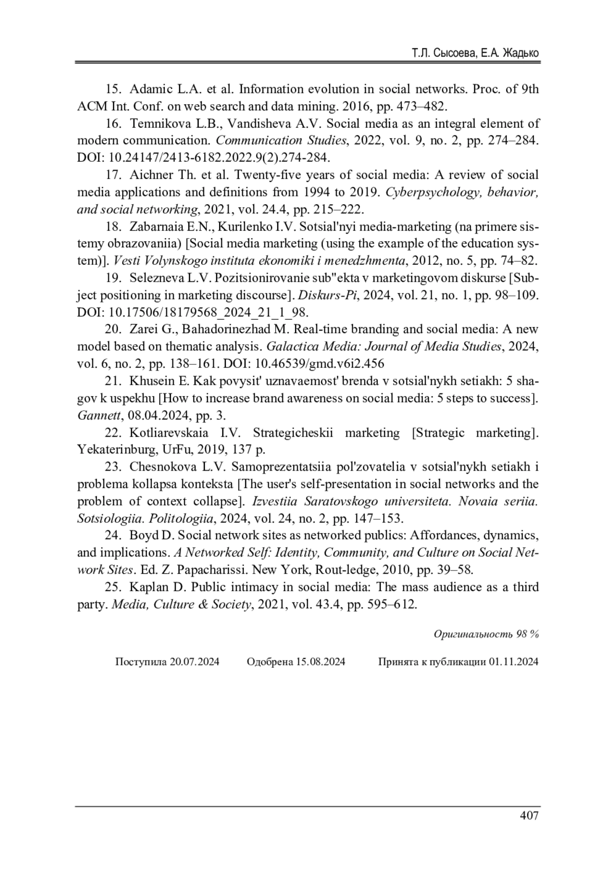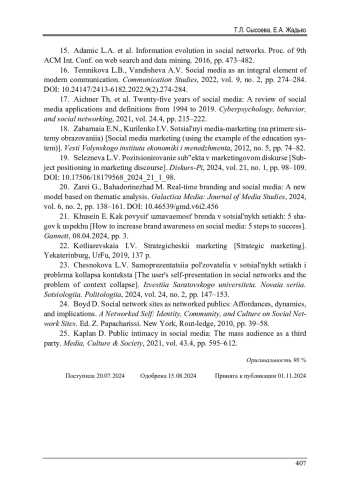 16. Temnikova, L.B. Social media as an integral element of modern communication / L.B. Temnikova, A.V. Vandisheva // Communication Studies. - 2022. - Vol. 9, no. 2. - P. 274-284. DOI: 10.24147/2413-6182.2022.9(2).274-284 EDN: SKHPCE