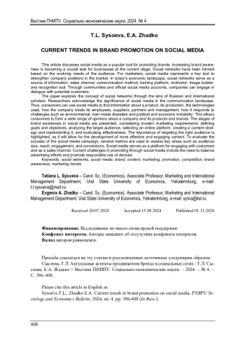Рассмотрены социальные сети как востребованный инструмент продвижения бренда. Повышение узнаваемости становится ключевой задачей бизнеса на современном этапе. Социальные сети сформировались на основе новых потребностей аудитории. Для маркетологов социальные сети являются ключевым инструментом для укрепления позиций компаний на рынке. Установлено, что в новых экономических реалиях социальные сети рассматриваются как источник информации, канал сбыта, способ коммуникации, обучения, мотивации, формирования имиджа и узнаваемости. Через сообщества, официальные аккаунты в социальных сетях компании могут вести диалог с потенциальными потребителями. В работе представлены подходы к понятию «социальные сети» российских и зарубежных авторов. Ученые признают роль социальных сетей в коммуникационной революции. Так, потребители с помощью социальных сетей могут найти информацию о продукте, где он производится, с помощью каких технологий, как компания относится к своим сотрудникам, поставщикам, партнерам, управленческому составу, как реагирует на вызовы времени, экологические, техногенные катастрофы, политическую и экономическую нестабильность. Таким образом потребители могут сформировать широкое и разнообразное мнение о компании, ее продуктах, брендах. Представлены этапы формирования узнаваемости бренда в социальных сетях с учетом современных требований к маркетинговой политики: определение целей и задач, анализ целевой аудитории, выбор онлайн-платформы, создание контент-плана и его реализация, оценка эффективности. Отмечается важность этапа сегментирования целевой аудитории, что позволят разрабатывать таргетированный и вовлекающий контент более эффективно. Для оценки результативности программы узнаваемости в социальных сетях рассмотрены группы метрик, позволяющих комплексно оценить: аудиторию, охват, активности и вовлеченность и конверсию. Социальные сети выступают способом вовлечения покупателей и каналом сбыта. Отмечены актуальные вызовы в контексте продвижения в социальных сетях - необходимость в снижении рекламного давления и ответственного потребления гаджетов.