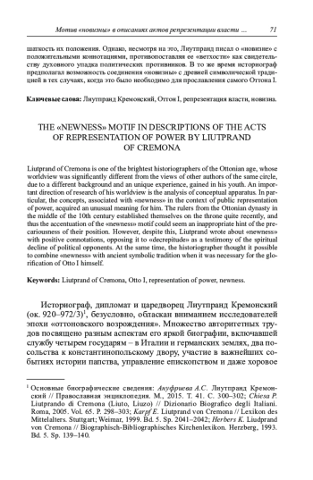 Статья: МОТИВ "НОВИЗНЫ" В ОПИСАНИЯХ АКТОВ РЕПРЕЗЕНТАЦИИ ВЛАСТИ У ЛИУТПРАНДА КРЕМОНСКОГО (2021)