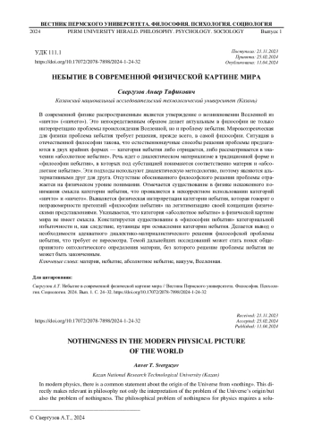 В современной физике распространенным является утверждение о возникновении Вселенной из «ничто» («ничего»). Это непосредственным образом делает актуальным в философии не только интерпретацию проблемы происхождения Вселенной, но и проблему небытия. Мировоззренческая для физики проблема небытия требует решения, прежде всего, в самой философии. Ситуация в отечественной философии такова, что естественнонаучные способы решения проблемы предлагаются в двух крайних формах - категория небытия либо отрицается, либо рассматривается в значении «абсолютное небытие». Речь идет о диалектическом материализме в традиционной форме и «философии небытия», в которых под субстанцией понимаются соответственно материя и «абсолютное небытие». Эти подходы используют диалектическую методологию, поэтому являются альтернативными друг для друга. Отсутствие обоснованного философского решения проблемы отражается на физическом уровне понимания. Отмечается существование в физике искаженного понимания смысла категории небытия, что проявляется в некорректном использовании категорий «ничто» и «ничего». Выявляется физическая интерпретация категории небытия, которая говорит о неправомерности претензий «философии небытия» на легитимизацию своей концепции физическими представлениями. Указывается, что категория «абсолютное небытие» в физической картине мира не имеет смысла. Констатируется существование в «философии небытия» категориальной избыточности и, как следствие, путаницы при осмыслении категории небытия. Делается вывод о необходимости адекватного диалектико-материалистического решения философской проблемы небытия, что требует ее пересмотра. Темой дальнейших исследований может стать поиск общепринятого онтологического определения материи, без которого решение проблемы небытия не может быть законченным.