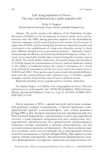 Статья рассматривает влияние политики партии Всегреческое социалистическое движение (ПАСОК) на развитие государственного сектора и бюрократии в Греции с 1980-х гг., уделяя особое внимание процессам национализации частных компаний и росту числа госслужащих. В статье обосновывается, что политика ПАСОК в указанный период имела популистский характер и способствовала созданию масштабной клиентелистской системы, где партийная принадлежность определяла доступ к государственным должностям, что вело к снижению эффективности управления и значительным бюджетным расходам. В результате Греция столкнулась с долговыми проблемами, которые усугубились в ходе экономического кризиса 2010-х гг. В статье также исследуется, как популистская логика, заложенная ПАСОК, оказала влияние на трансформацию политической системы Греции, включая крах традиционных партий, попадание Греции в порочный круг финансового расточительства и появление новых радикальных движений, таких как СИРИЗА и АНЭЛ, пришедших к власти на волне разочарования в существующем политическом устройстве, в то же время унаследовав от ПАСОК многие популистские стратегии, что еще более углубило кризис греческой политической системы.