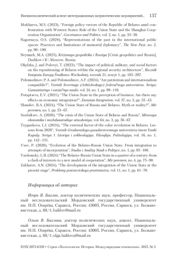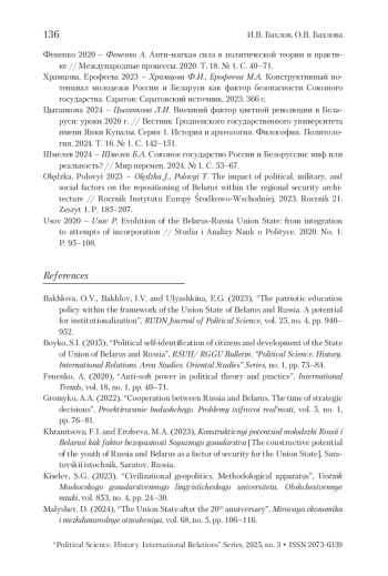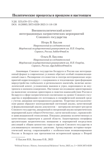 БАХЛОВ И. В., БАХЛОВА О. В. ВНЕШНЕПОЛИТИЧЕСКИЙ АСПЕКТ ИНТЕГРАЦИОННЫХ ПАТРИОТИЧЕСКИХ МЕРОПРИЯТИЙ СОЮЗНОГО ГОСУДАРСТВА // ВЕСТНИК РГГУ. СЕРИЯ: ПОЛИТОЛОГИЯ. ИСТОРИЯ. МЕЖДУНАРОДНЫЕ ОТНОШЕНИЯ. 2025. № 3