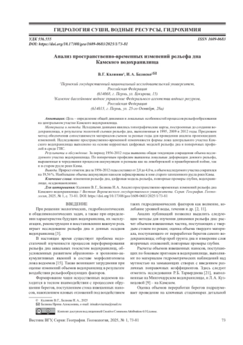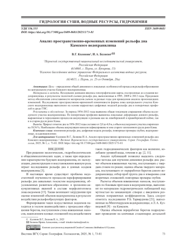 КАЛИНИН В. Г., БЕЛЯЕВА И. А. АНАЛИЗ ПРОСТРАНСТВЕННО-ВРЕМЕННЫХ ИЗМЕНЕНИЙ РЕЛЬЕФА ДНА КАМСКОГО ВОДОХРАНИЛИЩА // ВЕСТНИК ВОРОНЕЖСКОГО ГОСУДАРСТВЕННОГО УНИВЕРСИТЕТА. СЕРИЯ: ГЕОГРАФИЯ. ГЕОЭКОЛОГИЯ. 2025. № 1