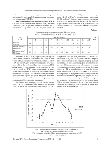 Цель - изучение особенностей сезонной изменчивости содержания растворенных органических веществ (РОВ) в воде Куйбышевского водохранилища и факторов её определяющих. Материалы и методы. Для достижения цели использованы данные мониторинга качества воды на Приплотинном плесе Куйбышевского водохранилища в период 2018-2022 годы. Отбор проб воды осуществлялся ежемесячно с поверхностного горизонта (0,5 м). Лабораторный химический анализ воды проводился в соответствии с действующими нормативными документами. Результаты и обсуждение. Внутригодовые колебания средних месячных значений содержания РОВ составляют: для биохимического потребления кислорода (БПК5) 1,5-2,2 мгО2/дм3, для перманганатной окисляемости (ПО) - 7,0-8,6 мгО2/дм3, для бихроматной окисляемости (БО) - 23-28 мгО2/дм3. Содержание РОВ характеризуется хорошо выраженной сезонной изменчивостью и включает четыре периода (I, II, III и IV), которые отличаются продолжительностью и разнонаправленностью трендов. В период I содержание РОВ постепенно увеличивается с января по май. Период II характеризуется уменьшением содержания РОВ и продолжается с середины мая до середины июня во время весеннего половодья. В период III содержание РОВ существенно увеличивается под воздействием процесса массового развития цианобактерий (МРЦ). В период IV содержание РОВ плавно уменьшается во время осенней и зимней межени. В сезонном разрезе наибольшее содержание РОВ наблюдается в летнюю межень, когда активно протекает процесс МРЦ. В результате содержание РОВ в июле - августе увеличивается в рамках БПК5 на 20-25 %, в рамках ПО - на 13-15 %, в рамках БО - на 4-6 %. Степень влияния процесса МРЦ на содержание РОВ зависит от погодных условий. Проблема роста содержания РОВ обостряется в жаркие и маловодные годы, когда на водохранилище активизируется процесс МРЦ, что существенно увеличивает содержание в воде легко окисляемых РОВ. Выводы. Высокое содержание РОВ существенно затрудняет использование Куйбышевского водохранилища для хозяйственно-питьевого водоснабжения и рыбного хозяйства. В перспективе проблема ухудшения качества воды будет только обостряться из-за роста биогенной нагрузки, потепления климата и активизации процесса МРЦ.