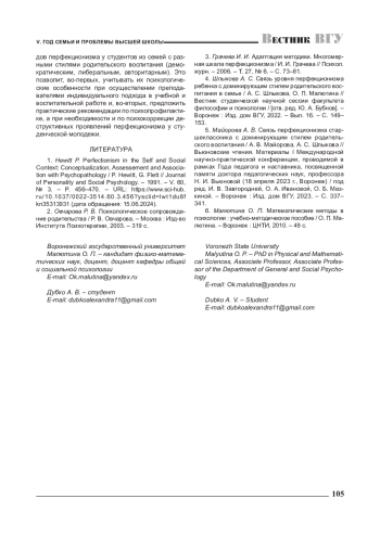 4. Шлыкова А. С. Связь уровня перфекционизма ребенка с доминирующим стилем родительского воспитания в семье / А. С. Шлыкова, О. П. Малютина // Вестник студенческой научной сессии факультета философии и психологии / [отв. ред. Ю. А. Бубнов]. -Воронеж: Изд. дом ВГУ, 2022. - Вып. 16. - С. 149153. EDN: CVSOIS
