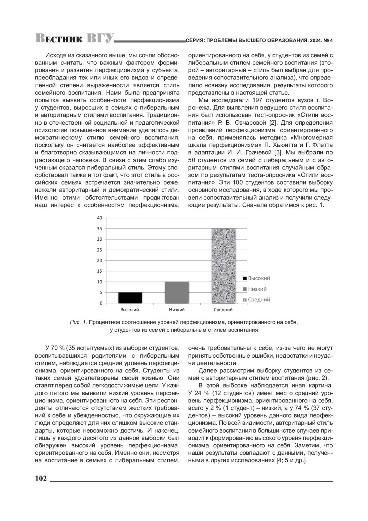 В представленном исследовании проведен сопоставительный анализ особенностей перфекционизма, ориентированного на себя, у студентов из семей с либеральным и авторитарным стилями семейного воспитания. Специфика исследования состоит в том, что в нем наряду с авторитарным изучался либеральный стиль семейного воспитания, которому в литературе уделено мало внимания в силу недостаточной его распространенности в российских семьях по сравнению с авторитарным и демократическим стилями. В результате авторами сделан вывод о том, что имеются статистически подтвержденные различия между показателями перфекционизма, ориентированного на себя, в выборках студентов из семей с либеральным и авторитарным стилями воспитания. Две выборки студентов отличаются по следующим характеристикам: воспитанные в авторитарных семьях не ставят перед собой трудно достижимые цели, не стремятся к максимальному приложению усилий, не стремятся быть совершенными, в то время как воспитанные в либеральных семьях студенты при постановке целей и стремлении к успеху демонстрируют адекватность в отношении и себя, и других, прилагая максимум усилий, не действуют в ущерб себе. Выявленные особенности студентов могут и должны учитываться при реализации индивидуального подхода к ним как в учебной, так и воспитательной работе.