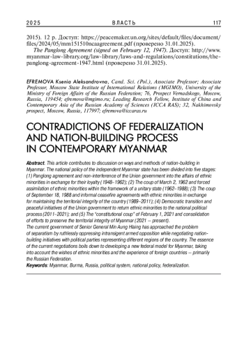 Статья раскрывает актуальную тему, связанную с перспективами установления мира и восстановления национального единства в Республике Союз Мьянма. В ней кратко освещаются истоки национальной политики Нейпьидо, обобщаются и систематизируются факторы, влияющие на процесс становления мьянманской государственности после обретения независимости, рассматриваются различия в подходах ведущих политических сил страны к проблеме федерализации и нациестроительства. Проводятся структурно- исторические параллели между российской и мьянманской политической традицией, подчёркивается важность российского опыта для постепенной трансформации политической системы Мьянмы в сторону её большей открытости и демократичности.