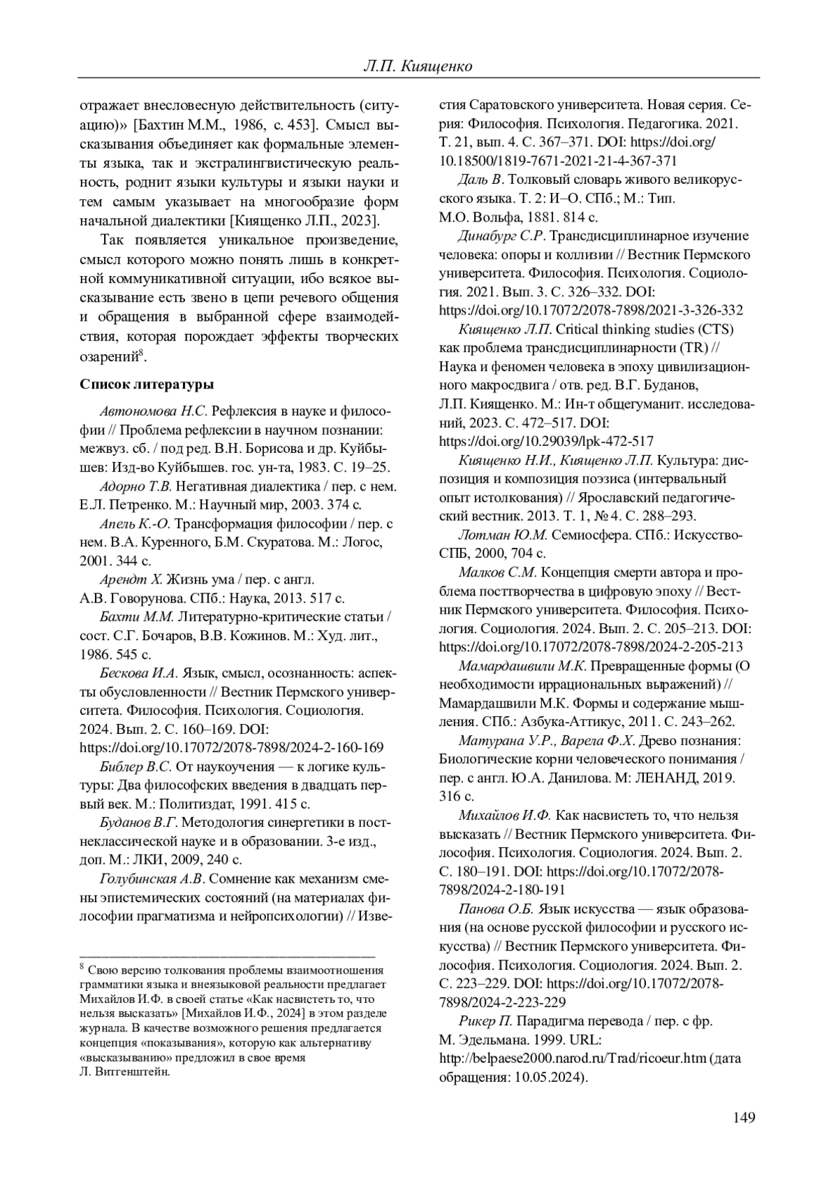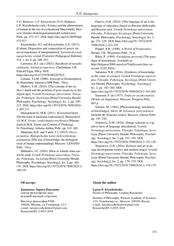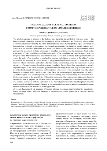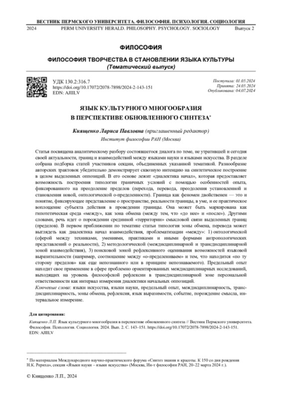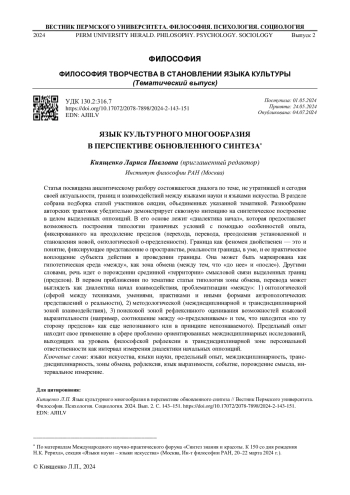 КИЯЩЕНКО Л. П. ЯЗЫК КУЛЬТУРНОГО МНОГООБРАЗИЯ В ПЕРСПЕКТИВЕ ОБНОВЛЕННОГО СИНТЕЗА // ВЕСТНИК ПЕРМСКОГО УНИВЕРСИТЕТА. ФИЛОСОФИЯ. ПСИХОЛОГИЯ. СОЦИОЛОГИЯ. 2024. № 2