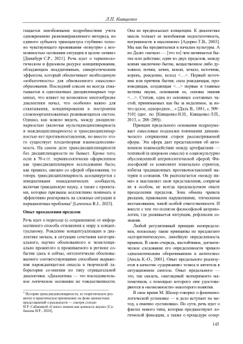 Статья посвящена аналитическому разбору состоявшегося диалога по теме, не утратившей и сегодня своей актуальности, границ и взаимодействий между языками науки и языками искусства. В разделе собрана подборка статей участников секции, объединенных указанной тематикой. Разнообразие авторских трактовок убедительно демонстрирует сквозную интенцию на синтетическое построение в целом выделенных оппозиций. В его основе лежит «диалектика начал», которая предоставляет возможность построения типологии граничных условий с помощью особенностей опыта, фиксированного на преодоление пределов (перехода, перевода, преодоления установленной и становления новой, онтологической о-пределенности). Граница как феномен двойственен - это и понятие, фиксирующее представление о пространстве, реальности границы, в уме, и ее практическое воплощение субъекта действия в проведении границы. Она может быть маркирована как гипотетическая среда «между», как зона обмена (между тем, что «до нее» и «после»). Другими словами, речь идет о порождении срединной «территории» смысловой связи выделенных границ (пределов). В первом приближении по тематике статьи типология зоны обмена, перевода может выглядеть как диалектика начал взаимодействия, проблематизации «между»: 1) онтологической (сферой между техниками, умениями, практиками и иными формами антропологических представлений о реальности), 2) методологической (междисциплинарной и трансдисциплинарной зоной взаимодействия), 3) поисковой зоной рефлексивного оценивания возможностей языковой выразительности (например, соотношение между «о-пределениваем» и тем, что находится «по ту сторону пределов» как еще непознанного или в принципе непознаваемого). Предельный опыт находит свое применение в сфере проблемно ориентированных междисциплинарных исследований, выходящих на уровень философской рефлексии в трансдисциплинарной зоне персональной ответственности как интервал измерения диалектики начальных оппозиций.