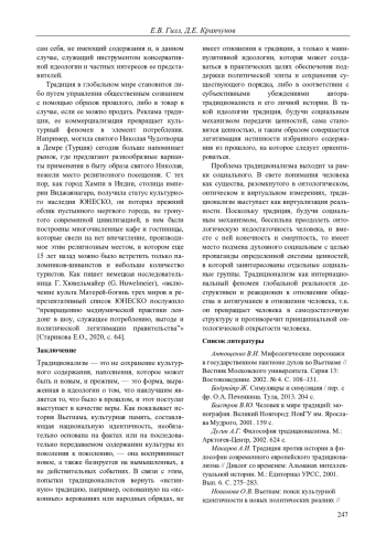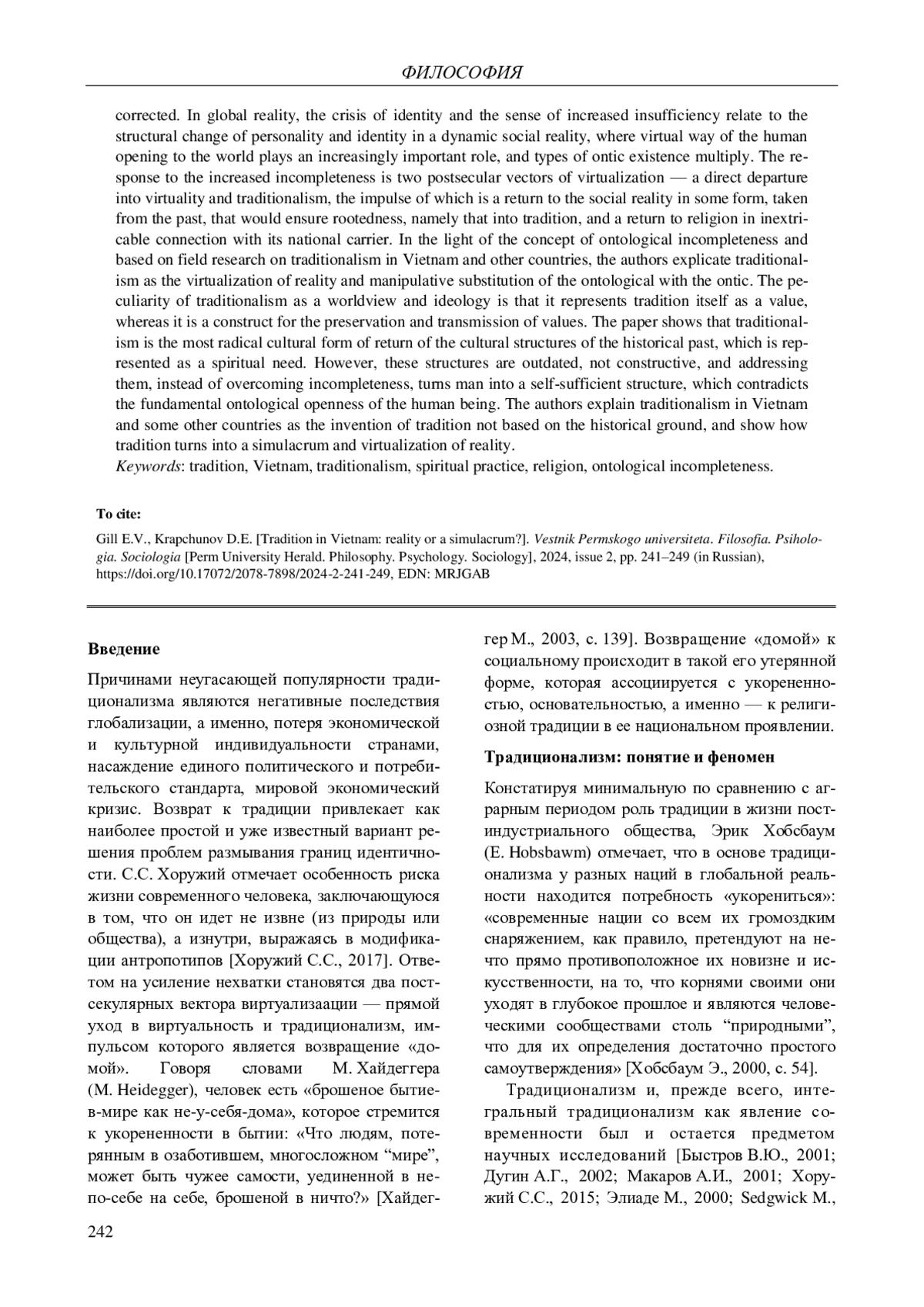 Статья посвящена феномену традиционализма в контексте онтологической недостаточности человека. В культуре существуют разные способы репрезентации недостаточности, которая может преодолеваться или корректироваться. В глобальной реальности кризис идентичности и усиление чувства нехватки связаны с изменением структур личности и идентичности в динамичной социальной реальности, где все большую роль играет виртуальный способ размыкания человека к миру, а также множатся виды онтического бытия. Ответом на усиление нехватки становятся два постсекулярных вектора виртуализации - прямой уход в виртуальность и традиционализм, импульсом которого является возвращение к социальному в такой его утерянной форме, которая бы обещала укорененность в традицию и возврат к религии в неразрывной связи с ее национальным носителем. В свете концепции онтологической недостаточности и на основе полевых исследований явлений традиционализма во Вьетнаме и других странах авторы эксплицируют традиционализм как виртуализацию реальности и манипулятивную подмену онтологического онтическим. Особенность традиционализма как мировоззрения и идеологии состоит в том, что она представляет саму традицию в качестве ценности, тогда как она есть механизм сохранения и передачи ценностей. Показано, что традиционализм представляет собой наиболее радикальную культурную форму возврата структур исторического прошлого, что представляется духовно необходимым. Однако эти структуры являются отжившими, неконструктивными и обращение к ним вместо преодоления недостаточности превращает человека в самодостаточную структуру, т. е. противоречит принципиальной онтологической открытости человека. Авторы объясняют традиционализм во Вьетнаме как изобретение традиции, не основанное на исторической почве, и показывают, как традиция превращается в симулякр и виртуализацию реальности.