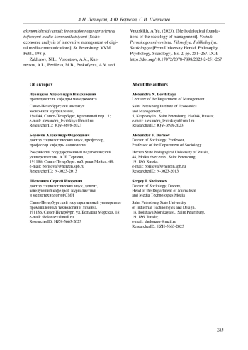 9. Захаров Н.Л., Кузнецов А.Л., Воронцов А.В., Перфильева М.Б., Прокофьева А.В., Внутских А.Ю. Методологические основания социологии управления // Вестник Пермского университета. Философия. Психология. Социология. 2023. Вып. 2. С. 251-267. DOI: 10.17072/2078-7898/2023-2-251-267 EDN: FOVIOU